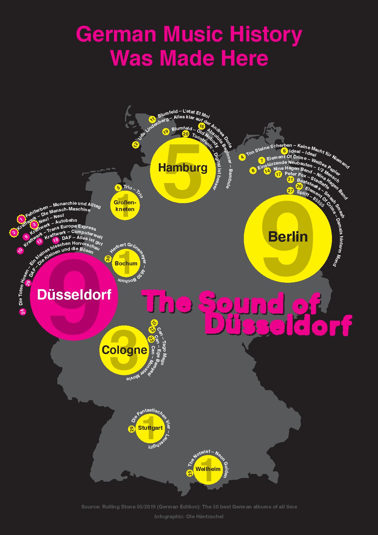 Time and again, Düsseldorf has produced influential and successful pop music. Musicians, artists and other creative minds have been gathering in the Altstadt (Old Town) for the last 50 years, where they have started up bands and influenced each other.