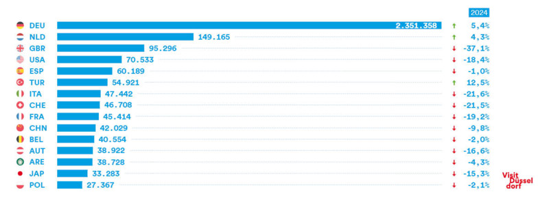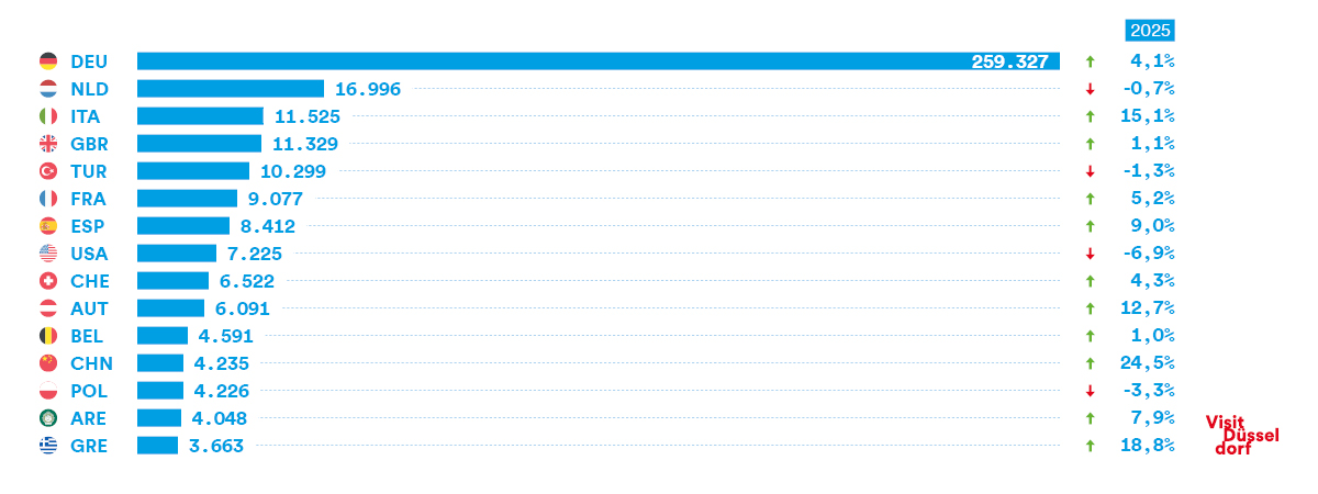 Hier finden Sie unter anderem statistische Daten zu Ankünften, Übernachtungen sowie zur Aufenthaltsdauer der Gäste in Düsseldorf - aufgeschlüsselt nach Herkunftsländern und Betriebsarten. Zur jeweiligen PDF-Übersicht gelangen Sie, nachdem Sie das Jahr und den für Sie relevanten Monat ausgesucht haben.